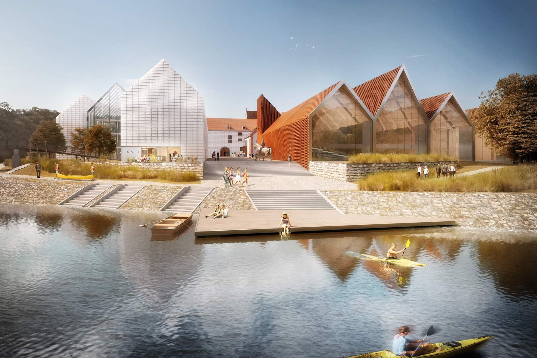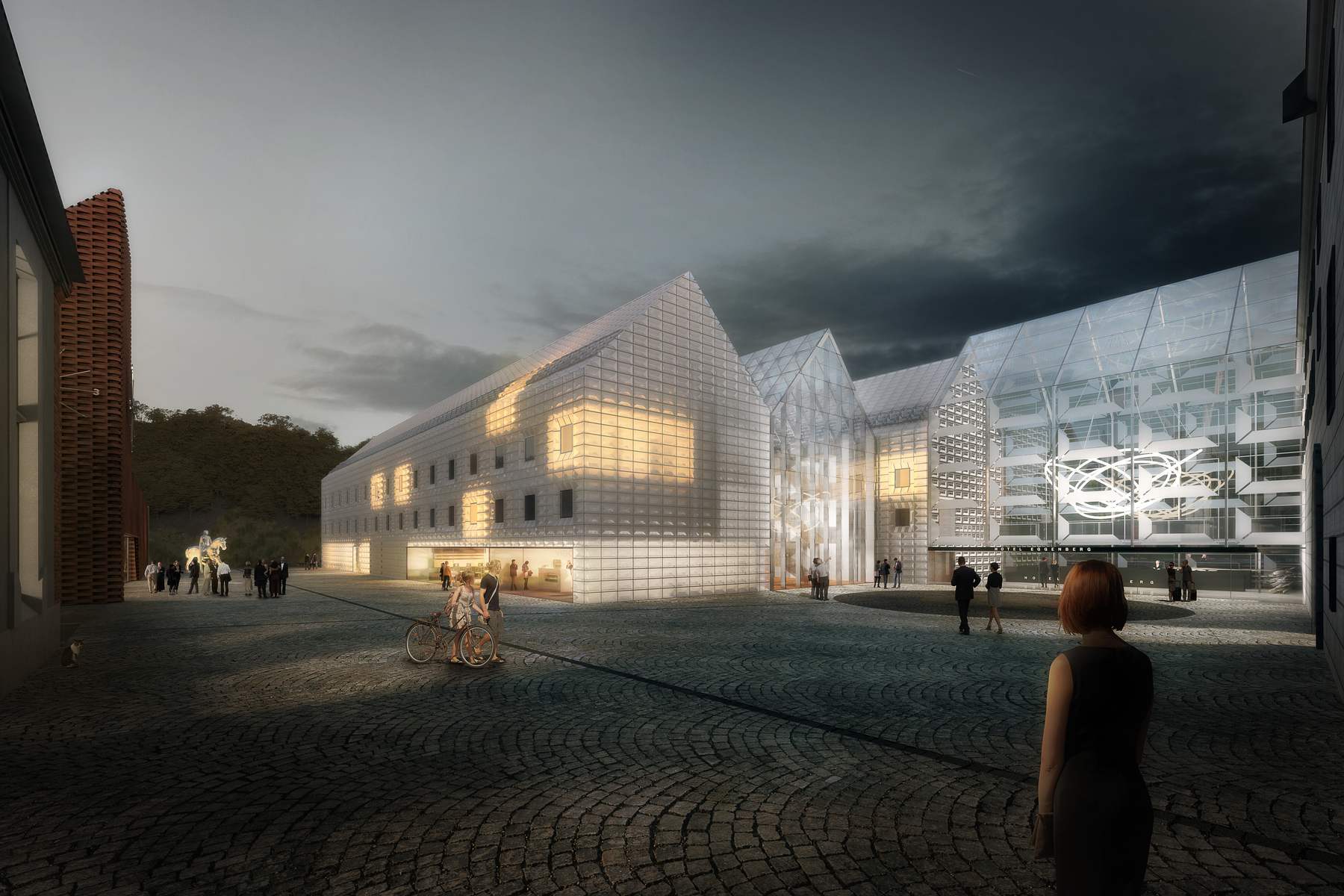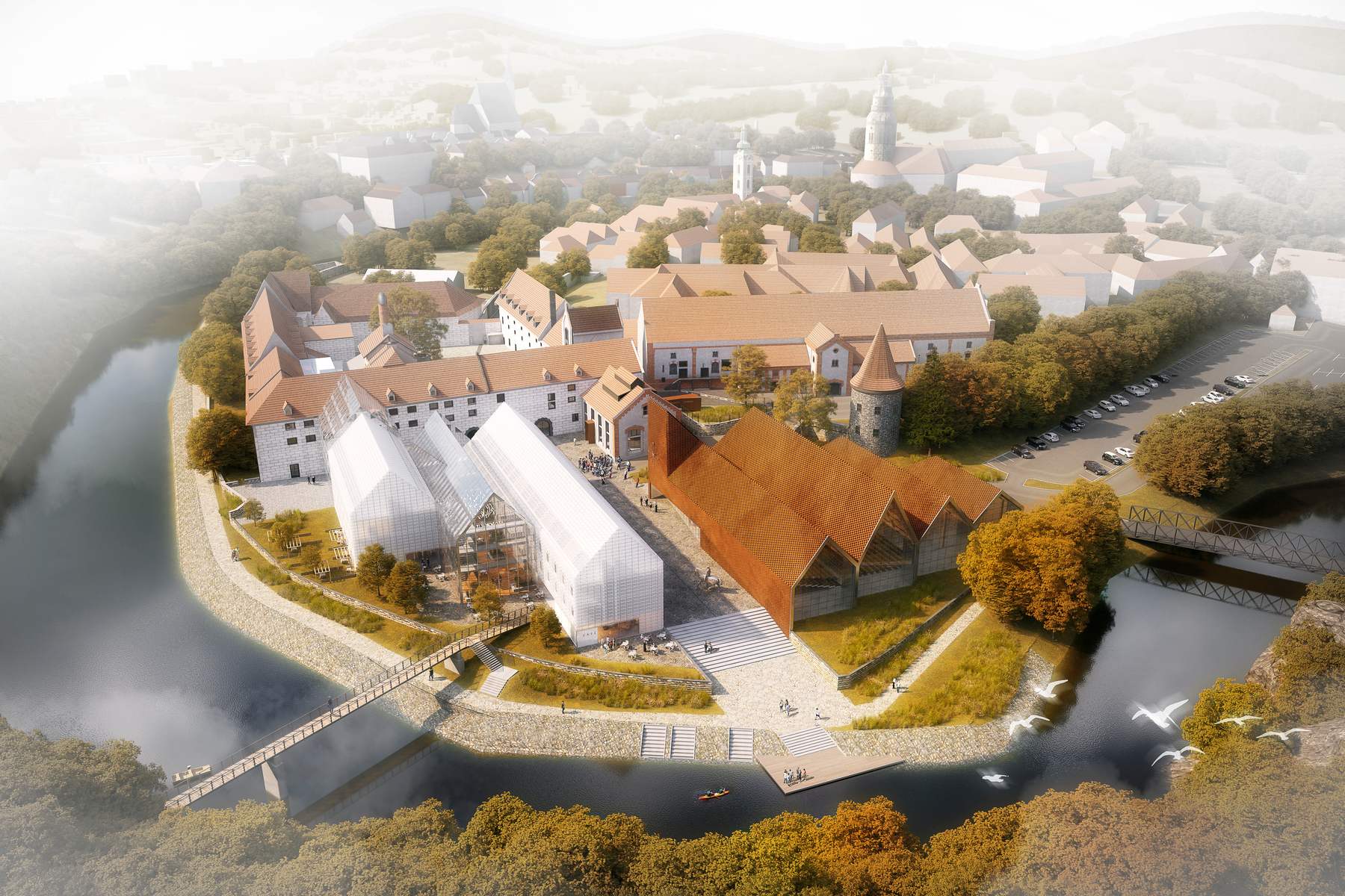 A key aspect of the proposal is the respect for historical architecture and the urban structure of Český Krumlov. The new buildings are inspired by traditional gabled houses with parallel roofs, typical of the historic city center, while a glass structure linking the hotel sections preserves visual transparency to the surrounding landscape and unites different functional areas of the complex. The overall concept creates a harmonious balance between the historical value of the site and its new uses, with newly defined courtyards, garden connections, and logical spatial organization ensuring a natural integration with the city's structure.