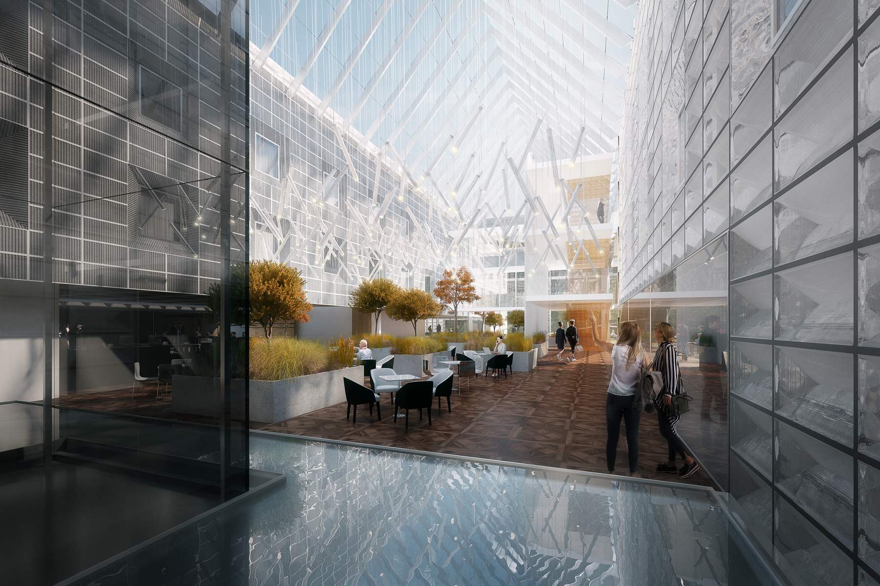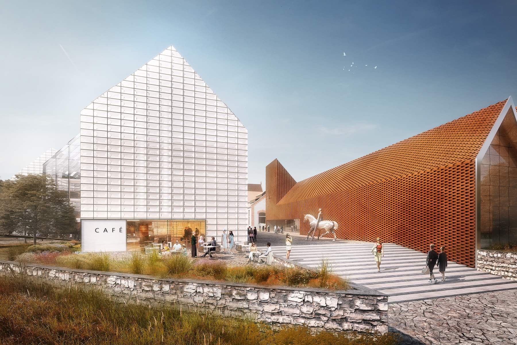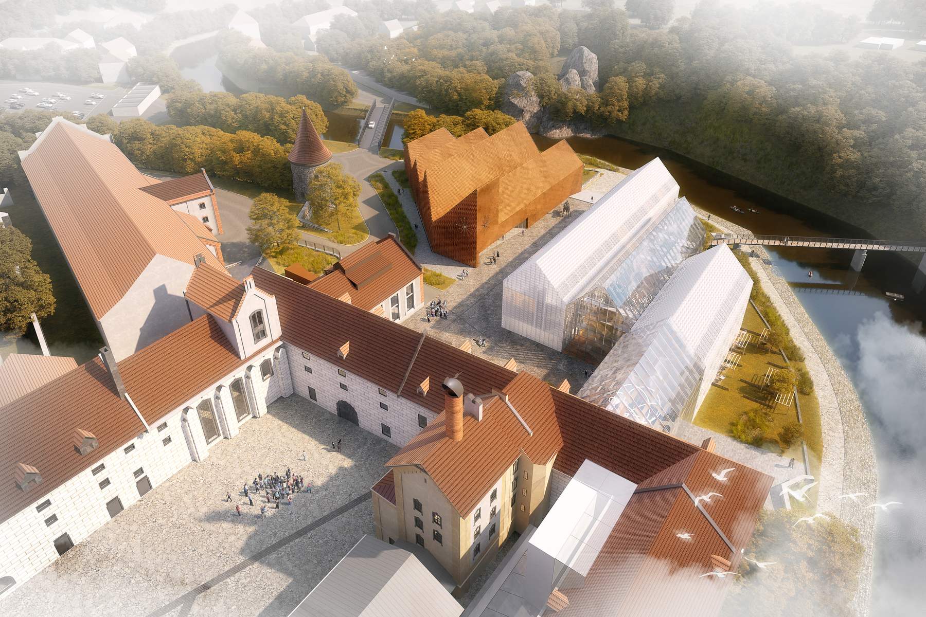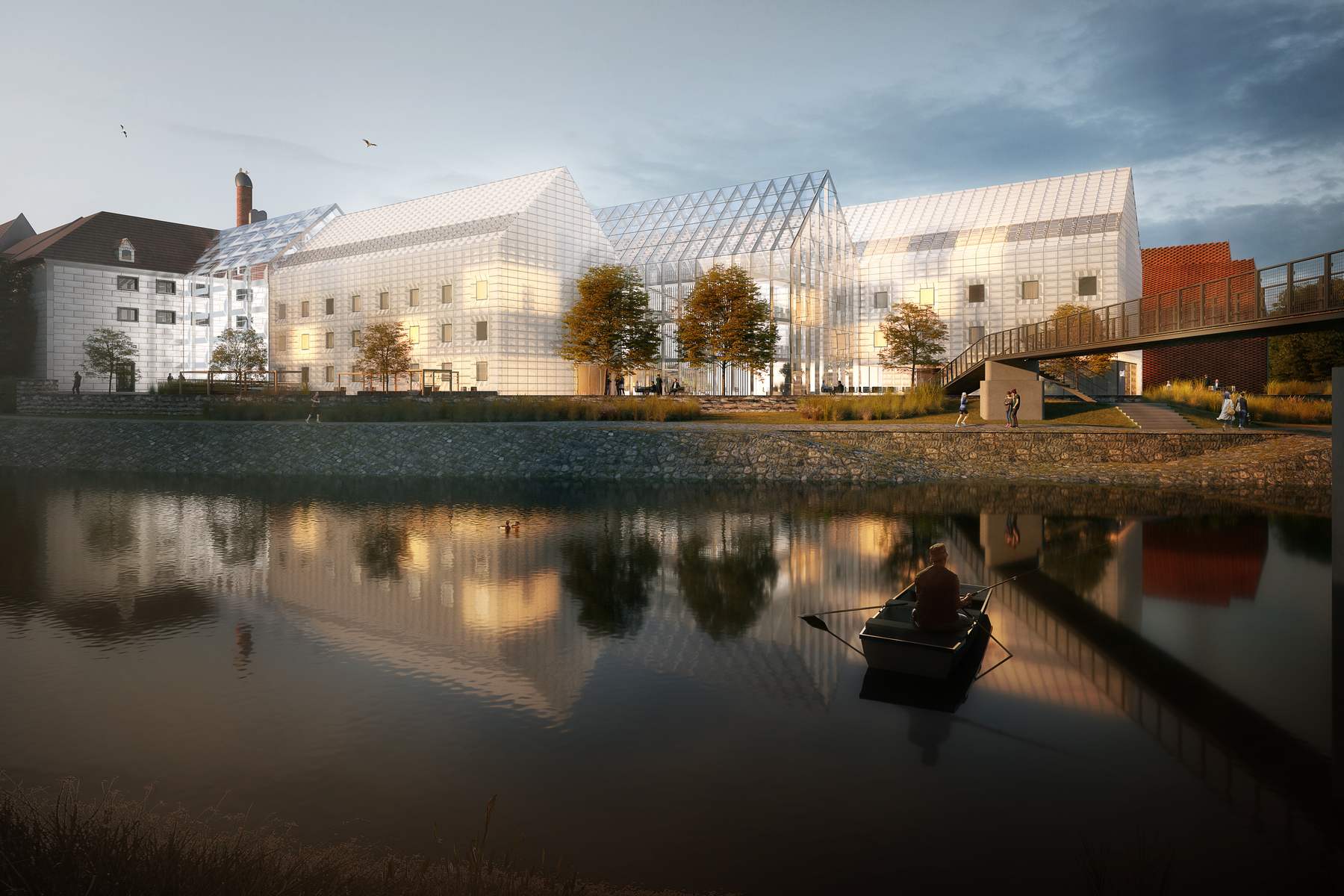A key aspect of the proposal is the respect for historical architecture and the urban structure of Český Krumlov. The new buildings are inspired by traditional gabled houses with parallel roofs, typical of the historic city center, while a glass structure linking the hotel sections preserves visual transparency to the surrounding landscape and unites different functional areas of the complex. The overall concept creates a harmonious balance between the historical value of the site and its new uses, with newly defined courtyards, garden connections, and logical spatial organization ensuring a natural integration with the city's structure.