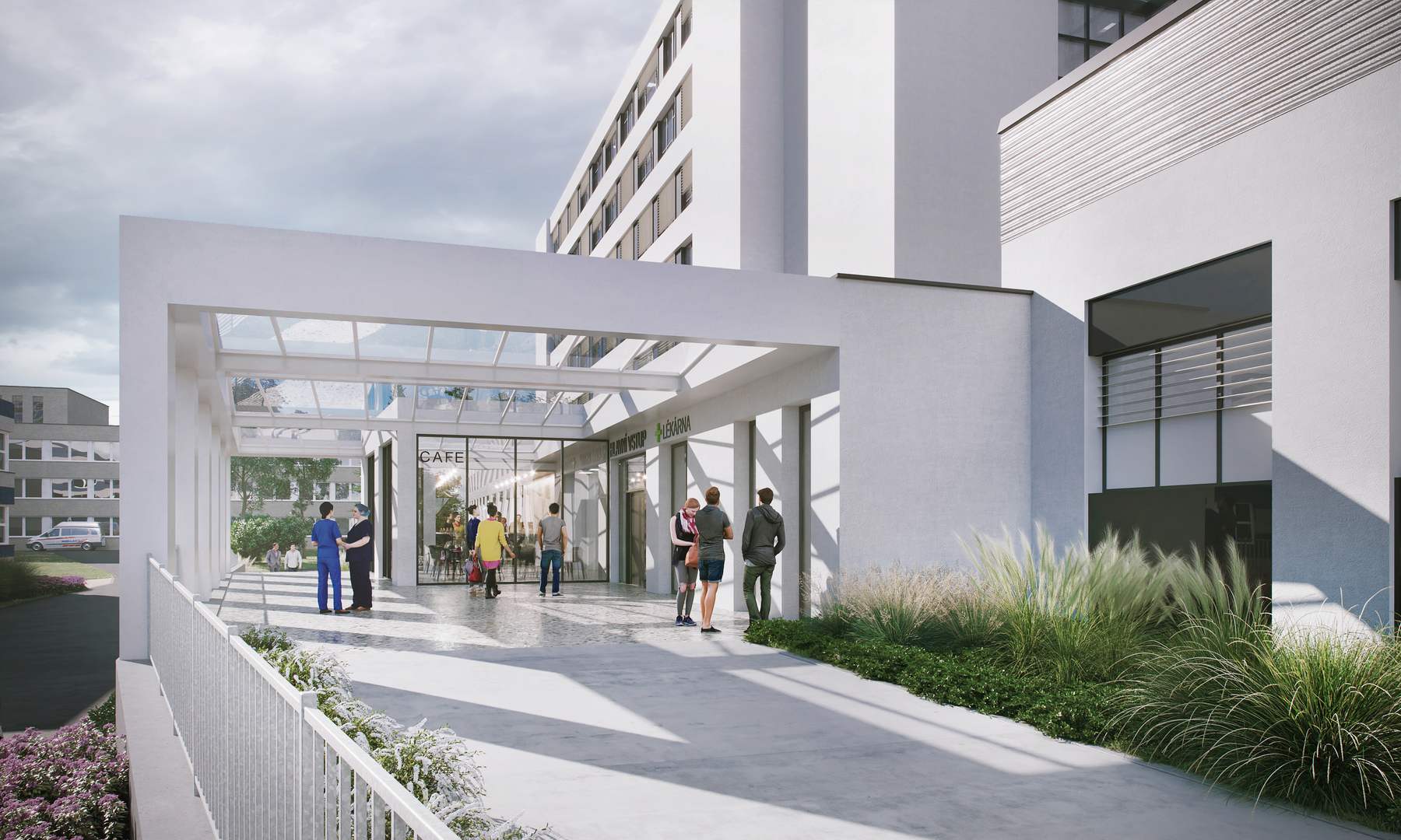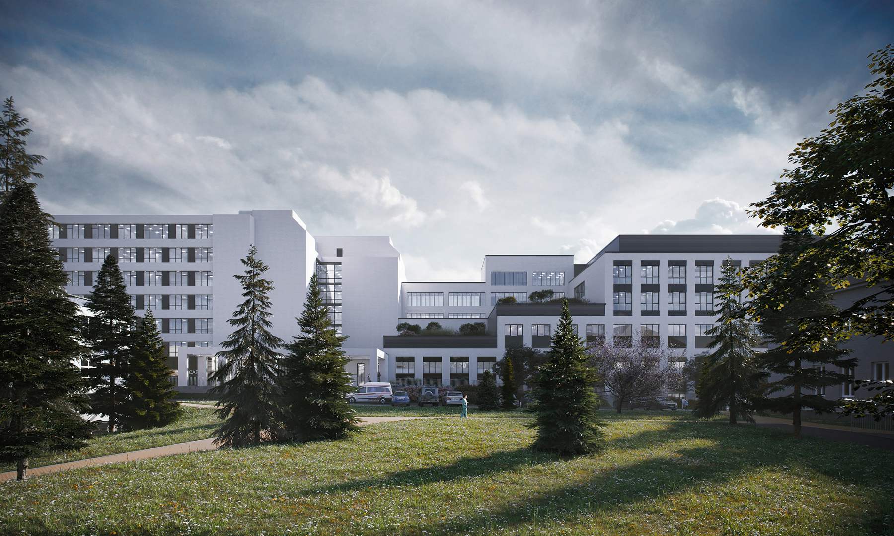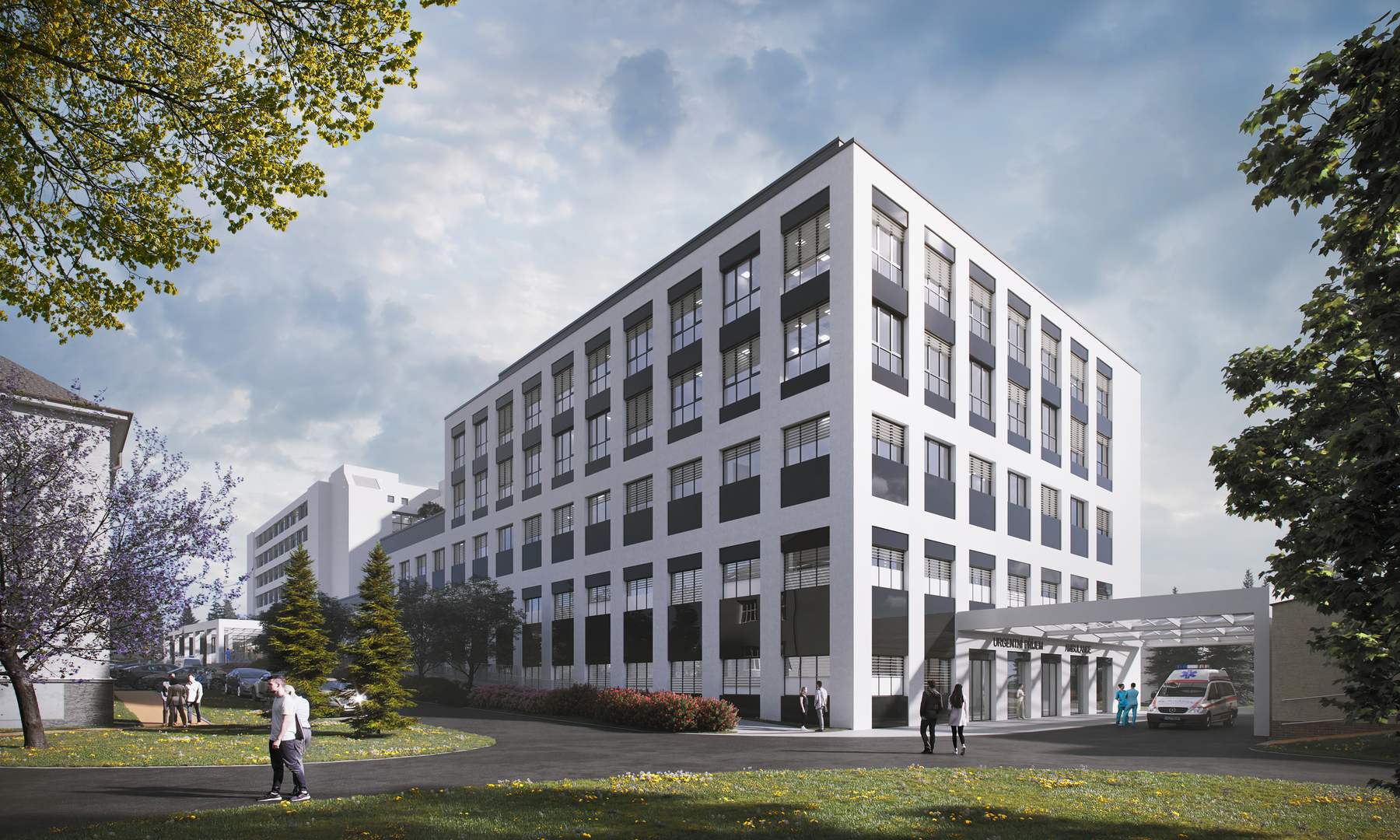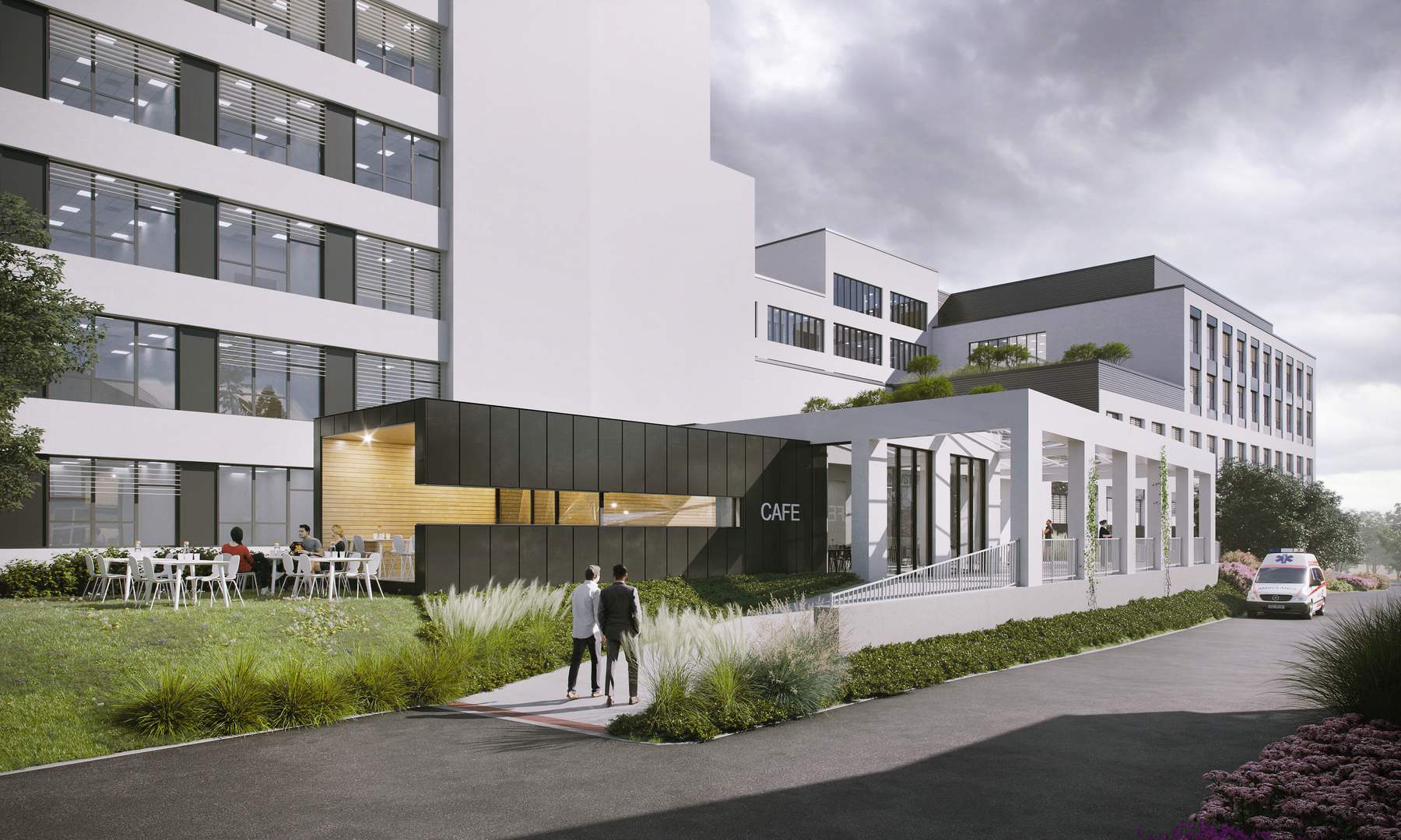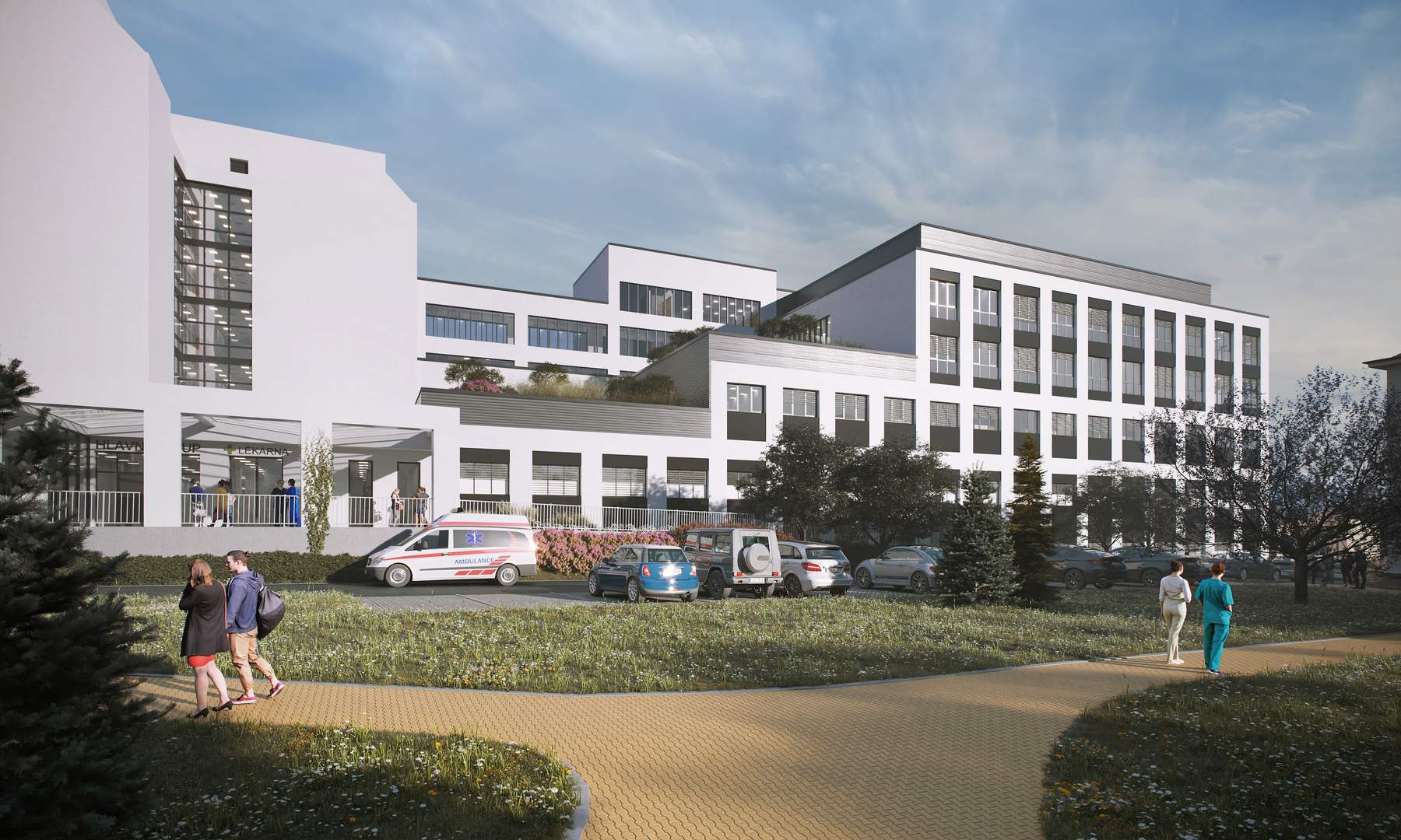 The project also involves modifications to the entrance area of the existing building, where a new lobby, pharmacy, café, and reception with support facilities will be created. As part of the modernization, the elevators will be replaced with evacuation lifts, and the technical rooms and infrastructure will be upgraded. The construction will ensure greater comfort for both patients and staff while meeting modern operational standards.