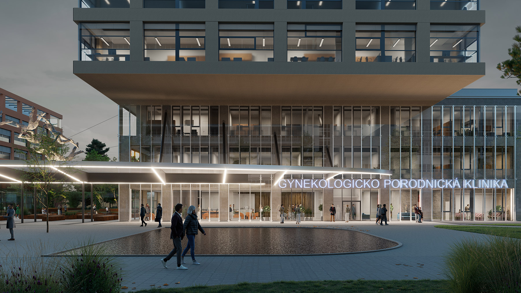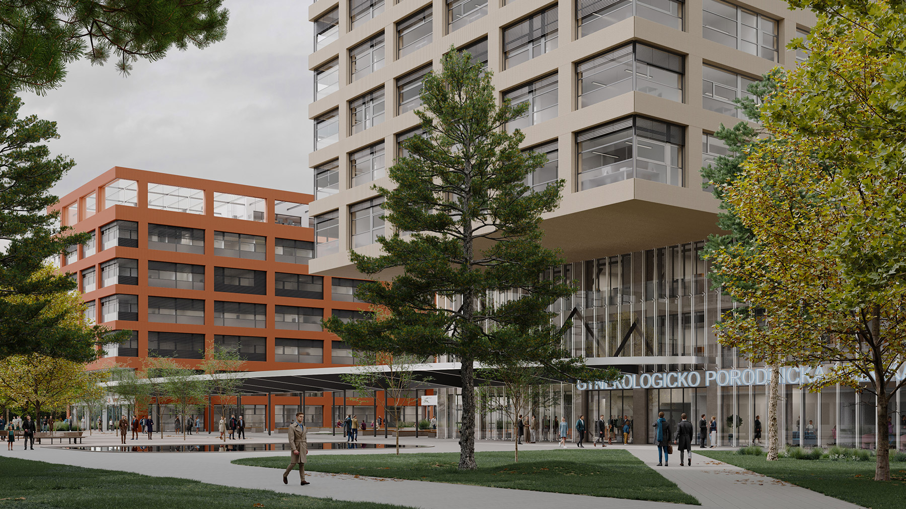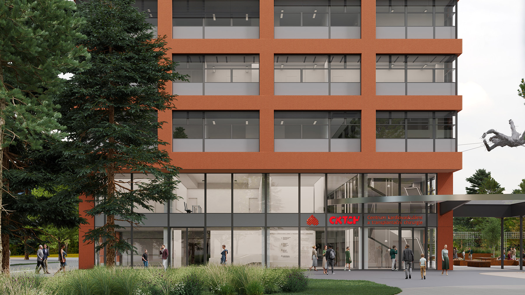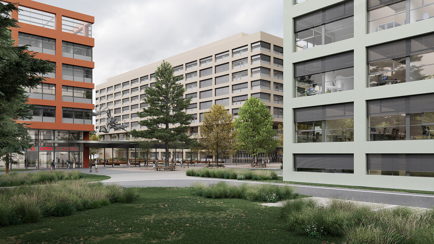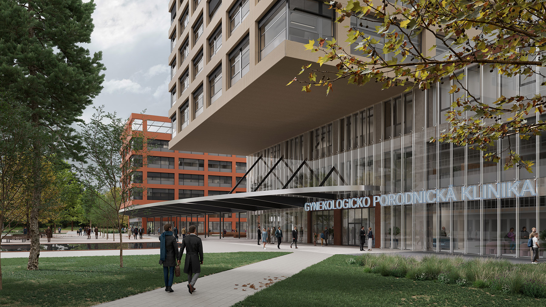 Three new buildings at Brno University Hospital—the Gynecology and Obstetrics Clinic (GPK), the Institutional Pharmacy, and the Cardiovascular and Transplant Surgery Center (CKTCH)—bring a modern architectural solution that complements and expands the existing hospital complex. The project focuses on functionality, simple forms, and a harmonious appearance, emphasized by ceramic façade cladding and a unified design