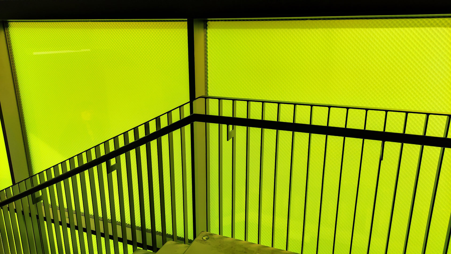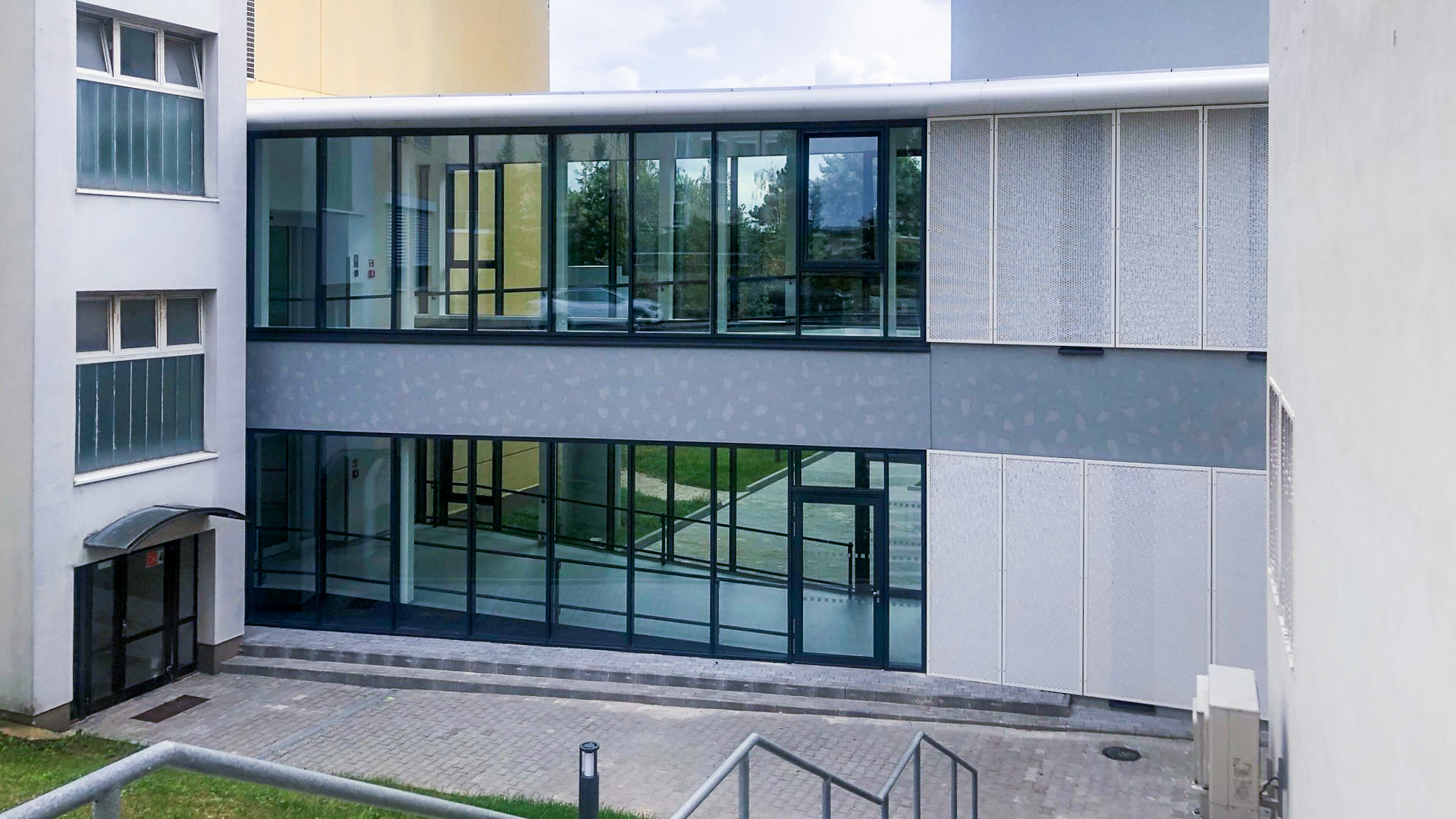 The building is a clearly defined extension, featuring modern materials and structural solutions. The facade of the first underground level combines clear and matte yellow glass, adding visual dynamism and brightness to the interior spaces. The second underground level houses radiation therapy chambers, which are functionally essential but less exposed to public view.
