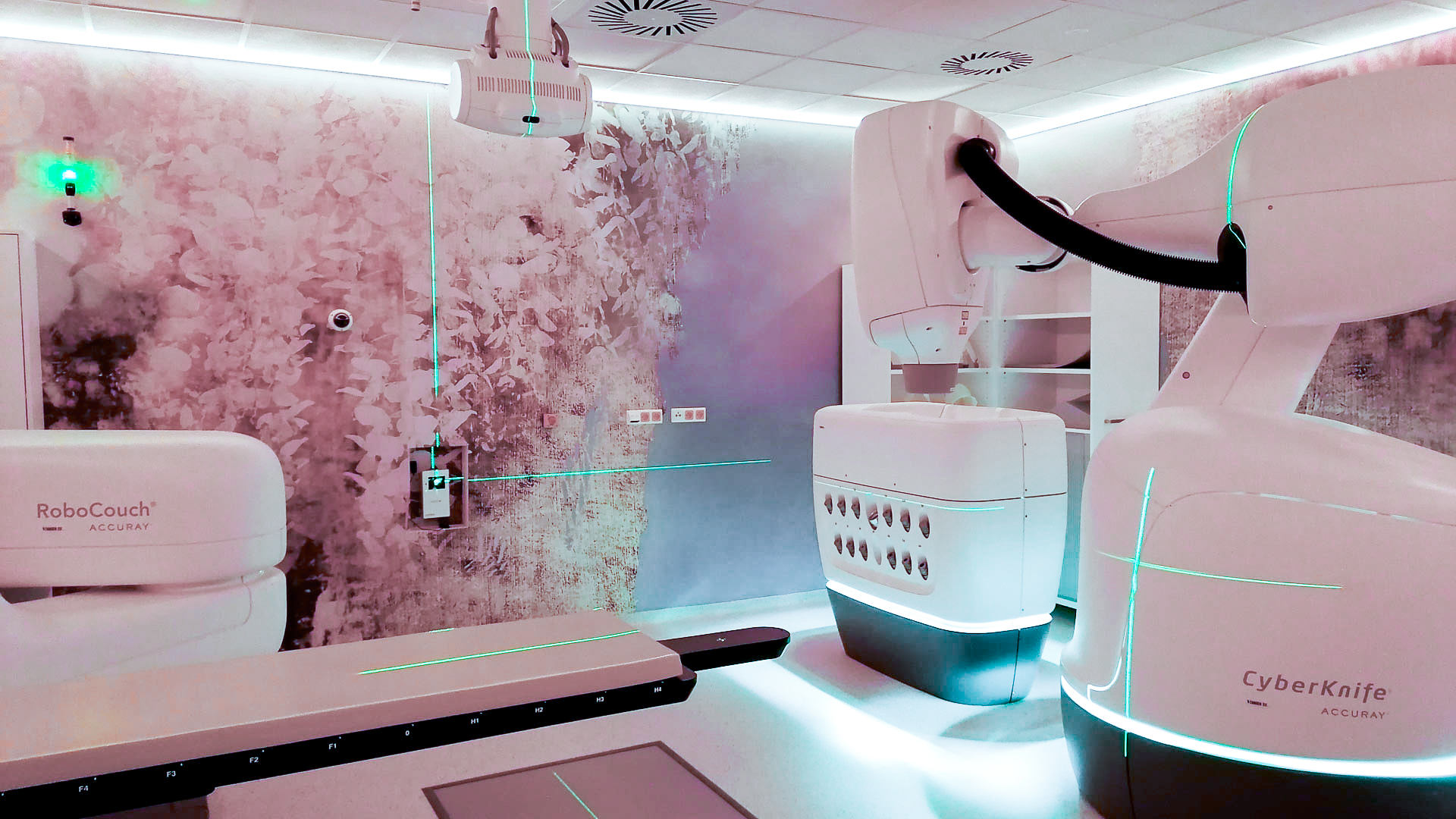 The interior is bright, spacious, and open, creating a calm and welcoming environment for both patients and staff. A significant technical feature is the two radiation chambers, with walls made of specialized concrete blocks one meter thick, meeting strict safety and technological standards.