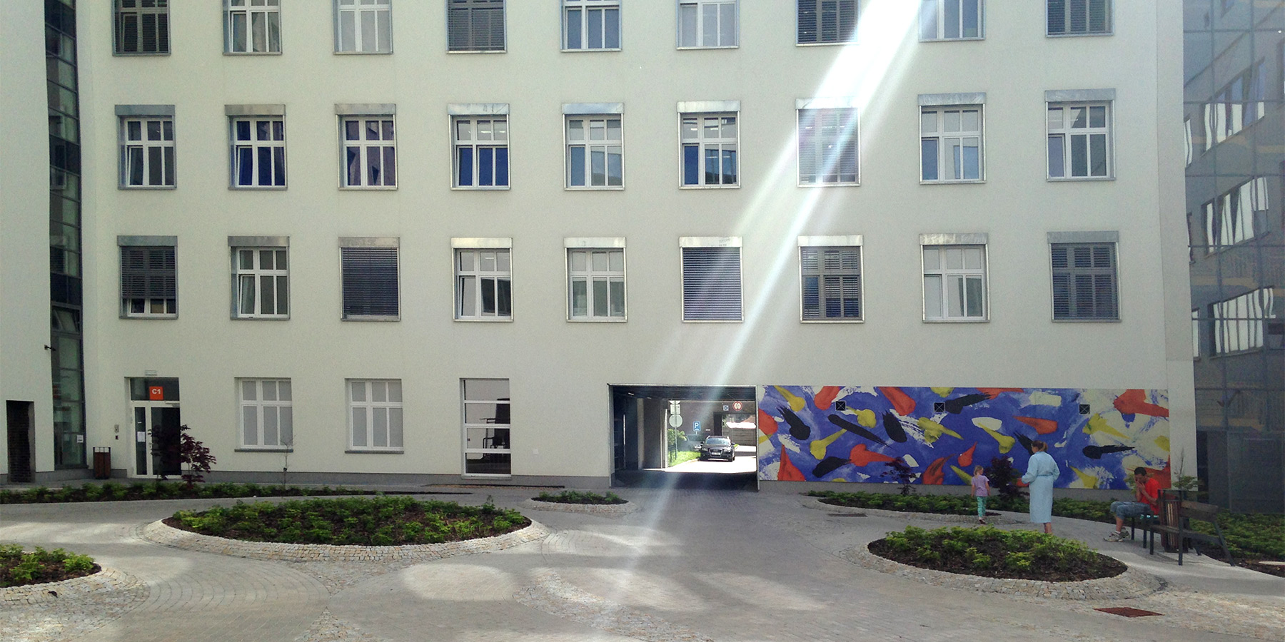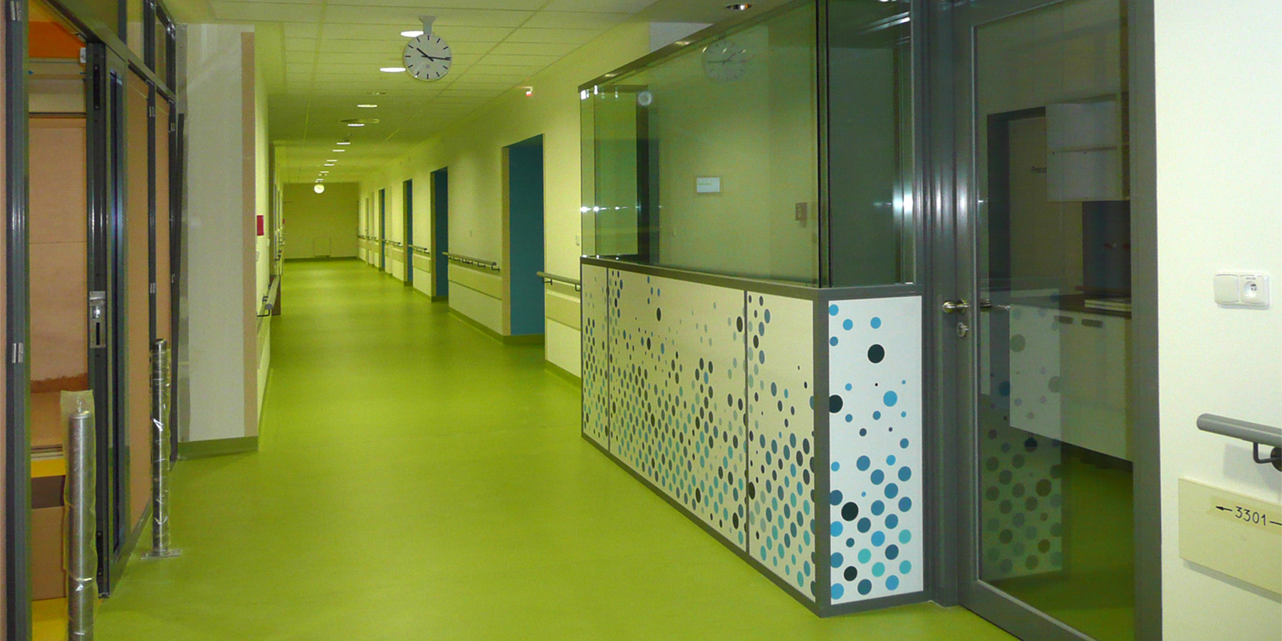 The façade renovation respects the character of the hospital building. As a prominent 20th-century structure with dominant façades, the existing monoblock requires a sensitive approach to color selection. The new façade colors and elements are inspired by the building’s original appearance while seamlessly integrating with the acute medical center.