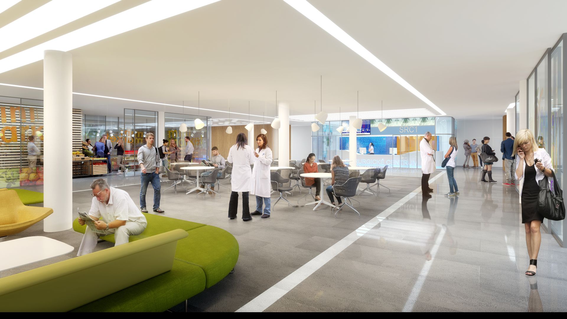 Nový hlavní vstup do CHC bude vytvořen na jižní straně, kde je možné vybudovat dostatečně kapacitní předprostor s mnoha funkcemi a napojením na parking a novou autobusovou zastávku. Nově dimenzovaný vjezd do areálu má za úkol odlehčit stávajícímu vjezdu a rovnoměrně rozložit vstup velkého množství pacientů na dvě strany. Novostavba je navržena pětipodlažní, lůžkové jednotky jsou soustředěny vždy 4 na jedno podlaží. Je to variabilní a ekonomické řešení, které nevylučuje různé kombinace klinik, lepší sdílení zázemí i komplementu a ani případné navýšení objektu.